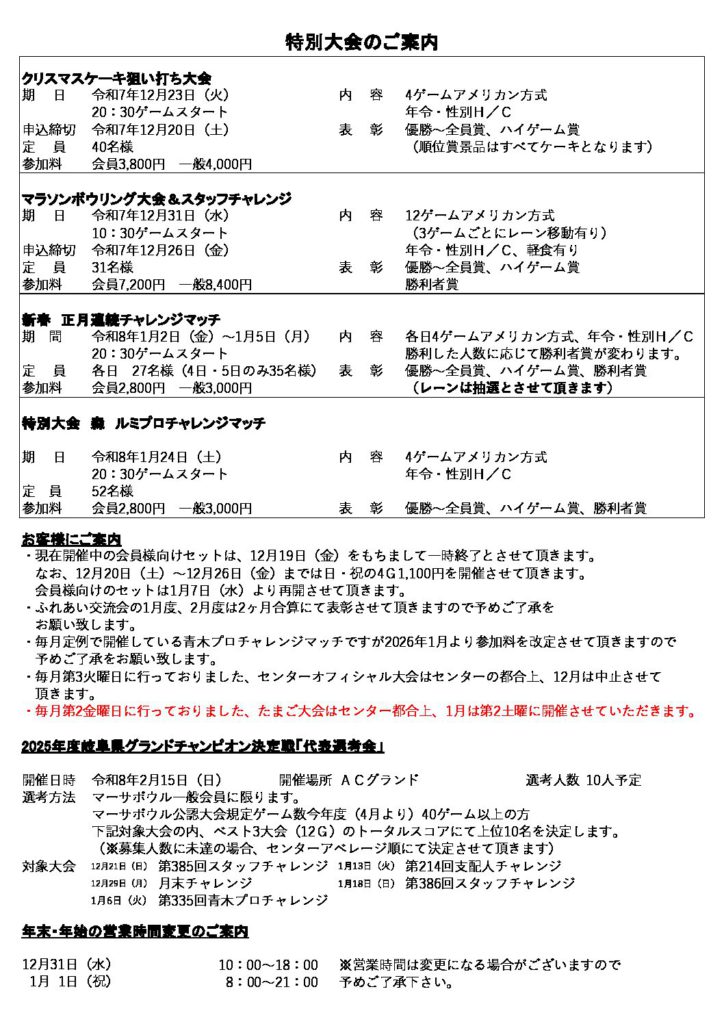 | 31 | 水 | 10:30 | マラソンボウリング大会 | 12G | フリー | 8,400 | 7,200 | ○ | A |