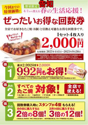 築地銀だこ 皮は"パリッ"!と 中は"トロッ"!と たこは"プリッ"!と 築地銀だこの"ぜったいうまいたこ焼"です 店舗情報を見る 築地銀だこ「大創業祭」 2023年02月23日 築地銀だこ 今年も 『大創業祭』 開催決定! ~ 3月1・2・3日の3日間は、"サンキューセール"! 感謝を込めた特別価格でご提供! 4・5日は、スタンプ2倍!! 創業記念日(14日)は、スタンプ3倍!!! ~そしてそして4日からは絶対お得な春の回数券を販売致します。今回までお値段据え置き!これはもう買うしかない!!数量限定です。お早めにお買い求めください。 次の記事:本日より決算SALEスタート!!(ミルフローラ) 前の記事:ミニーデーキャンペーン開催!オリジナルチュール巾着をプレゼント♪<ディズニーストアクラブ>(ディズニーストア) 一覧に戻る